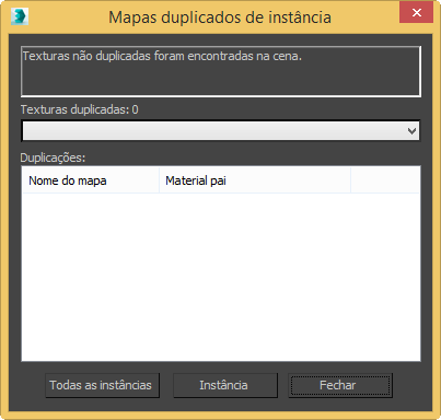 O utilitário de Mapas Duplicados da Instância busca mapas de uma cena completa para materiais que tenham mapas de bitmap duplicados e oferecem a opção de instanciá-los. Se sua cena tiver diferentes materiais que usam os mesmos mapas de textura, criar instâncias irá reduzir a carga na sua placa de vídeo, o que pode aprimorar o desempenho da viewport.