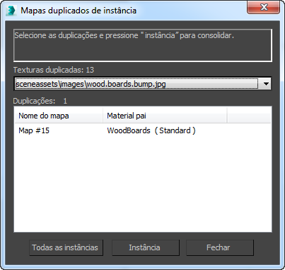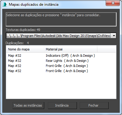 Quando você selecione uma textura da lista de texturas de duplicados, o 3ds Max exibe seu duplicados na lista, mostrando duplica o mapa e o nome do material principal. O número após " duplica” indica quantas cópias foram encontrados na cena. Texturas nesta lista podem ser selecionados individualmente. Somente duplica escolhido na lista serão consolidados em última instância se você clicar no botão de instância. O nome da instância resultante é o primeiro escolhido Duplicar na lista.