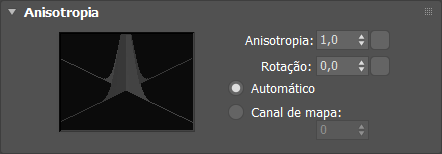 - O ângulo da anisotropia. A faixa de 0 a 1 mapeia uma revolução completa. Clique no botão próximo a Anisotropia para selecionar um mapa, um material de cena ou uma amostra.