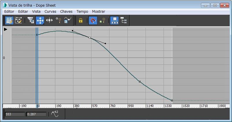 O Editor de animação de Objeto inserido exibe movimento como uma série de curvas de função em um gráfico. O movimento no 3ds Max é definido por uma série de teclas de animação e o 3ds Max calcula automaticamente os valores interpolados entre cada chave para produzir uma animação concluída.