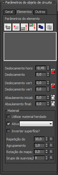 Os controles desta guia permitem editar os parâmetros de qualquer elemento no perfil do objeto de varredura. Cada elemento é uma única superfície no objeto de varredura e apresenta um deslocamento horizontal e vertical, junto com uma seleção de canais de materiais.