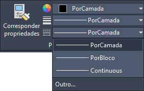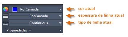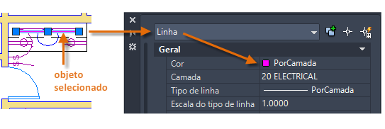 Observe que as propriedades atuais do objeto selecionado são exibidas na paleta Propriedades. É possível alterar as propriedades clicando em qualquer uma delas e alterando a configuração. A propriedade definida como “PorCamada” herda a configuração da sua camada. No exemplo anterior, os objetos que foram criados na camada 20 ELETRICO são roxos, já que é a cor padrão para os objetos daquela camada.