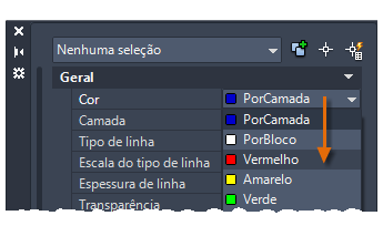 A paleta Propriedades exibe uma lista de todas as configurações de propriedades importantes. Você pode clicar em qualquer um dos campos disponíveis para alterar a configuração atual. No exemplo a seguir, se nenhum objeto for selecionado, a cor atual será alterada de PorCamada para Vermelho. Será atribuída a propriedade de cor Vermelho a todos os objetos criados subsequentemente.
