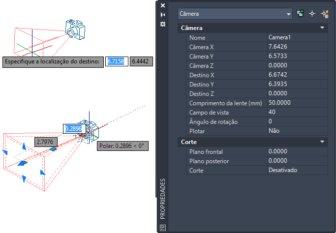 Você pode modificar o comprimento da lente da câmera, alterar seus planos de corte frontais e posteriores, nomear uma câmera e ativar e desativar a exibição de todas as câmeras em um desenho.