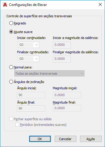 Controla o ângulo de inclinação e a magnitude da primeira e da última seção transversal do sólido ou da superfície elevada. O ângulo de inclinação está na direção inicial da superfície. 0 é definido como o exterior de um plano de curva. (variável de sistema LOFTNORMALS)