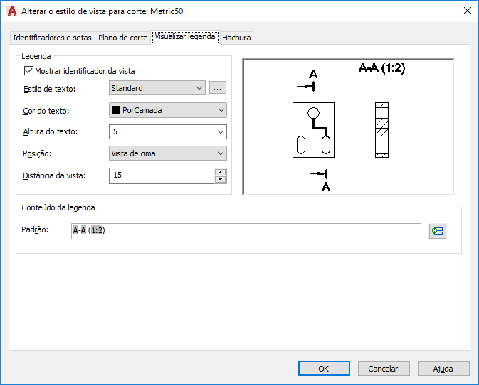 Define a posição da legenda da vista em corte em relação à vista em corte.