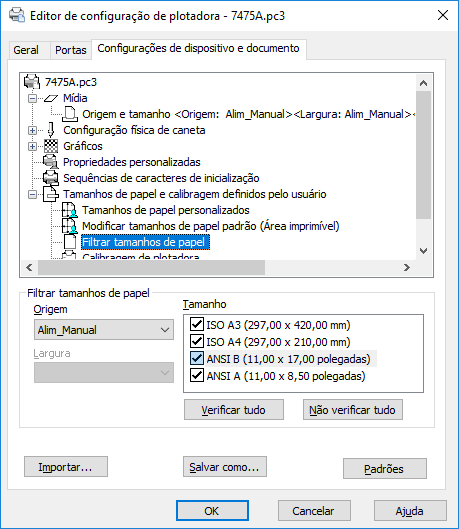 Selecione os tamanhos de papel que você deseja exibir para esse dispositivo.