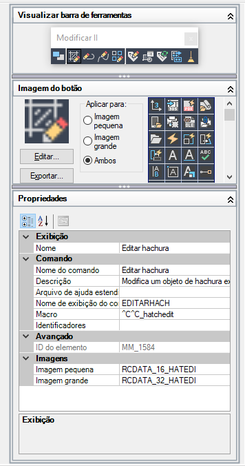 O painel Exibição dinâmica mostra uma visualização prévia do elemento da interface do usuário selecionado no painel Personalizações em. Permite editar a imagem de um comando selecionado no painel Lista de comandos e as propriedades específicas do item selecionado no painel Personalizações em ou no painel Lista de comandos.