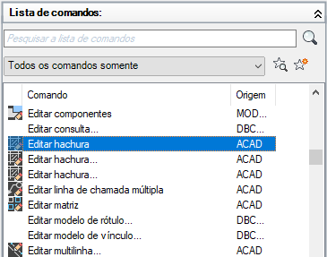 Na parte superior do painel Lista de comandos está a caixa Pesquisar lista de comandos, que permite filtrar a Lista de comandos com base na sequência de texto inserida. A sequência de texto é comparada com qualquer parte de um nome de comando e os resultados são exibidos na caixa Lista de comandos.