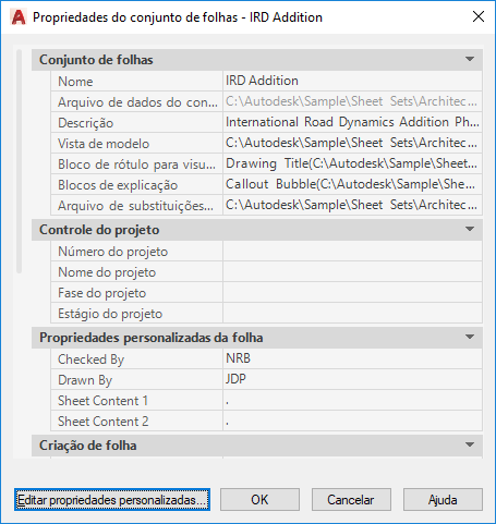 Exibe a caixa de diálogo Propriedades personalizadas do conjunto de folhas.