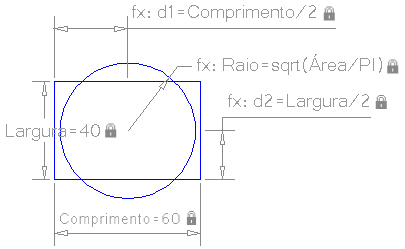 As fórmulas e equações podem ser representadas como expressões dentro dos parâmetros de restrições de cota ou ao definir variáveis do usuário. Por exemplo, a ilustração a seguir representa um projeto que contém um círculo para o centro do retângulo com uma área igual ao do retângulo.