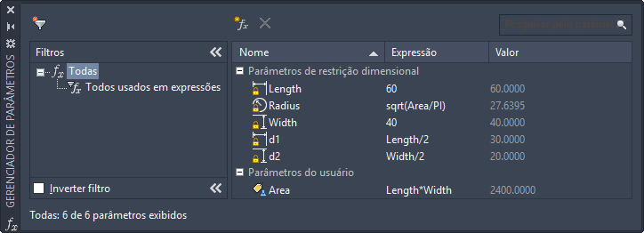 As restrições de cota Comprimento e Largura são definidas como constantes. As restrições d1 e d2 são expressões simples que referenciam Comprimento e Largura. O parâmetro de restrição de cota Raio é definida como uma expressão que inclui a função de raiz quadrada, parênteses para determinar a precedências das operações, a variável do usuário Área , o operador de divisão e a constante PI. Estes parâmetros podem ser acessados no Gerenciador de parâmetros.