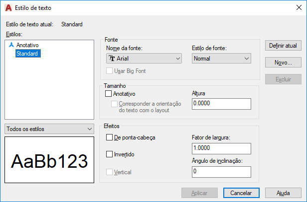 Define a altura do texto com base no valor digitado. Inserir uma altura maior do que 0.0 define automaticamente a altura do texto para este estilo. Se inserir 0.0, a altura do texto padronizará para a última altura usada ou para o valor armazenado no arquivo do modelo do desenho.