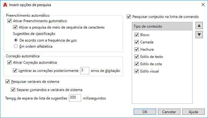 Controla as configurações para exibir a lista de sugestões da linha de comando para comandos, variáveis de sistema e conteúdo nomeado, tais como blocos e camadas.