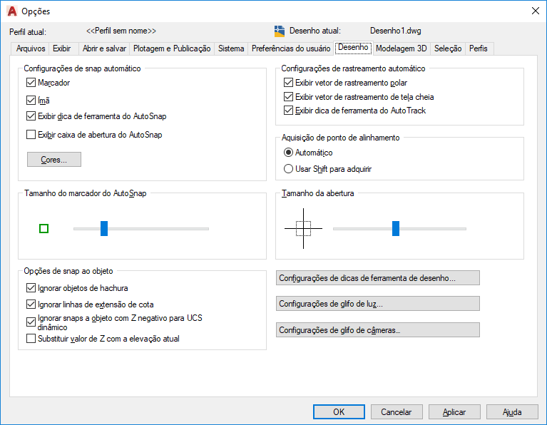 Define opções para vários recursos de edição, incluindo AutoSnap e AutoTrack.