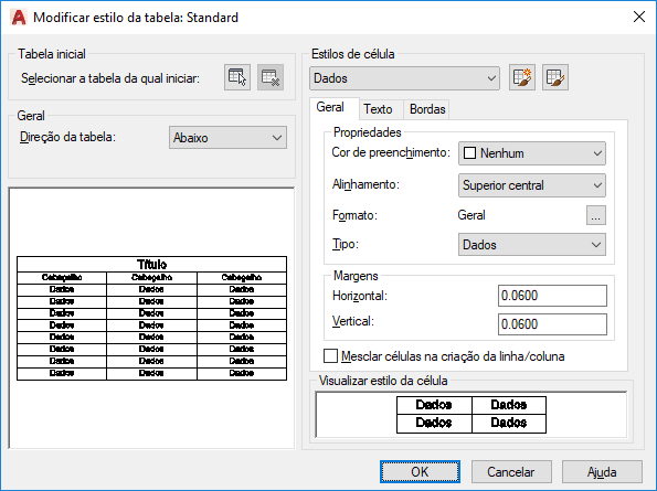 Controla o espaçamento entre a borda da célula e o conteúdo da mesma. Os ajustes de margem de célula são aplicados a todas as células da tabela. O ajuste padrão é 0.06 (imperial) e 1.5 (métrico).