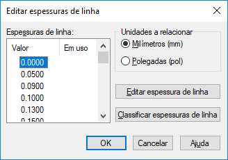 Relaciona as espessuras de linha na tabela de estilos de plotagem. Você pode modificar espessuras de linha existentes, mas não pode adicioná-las ou excluí-las. Se você alterar o valor de uma espessura de linha, outros estilos de plotagem que utilizem a espessura de linha também serão alterados.