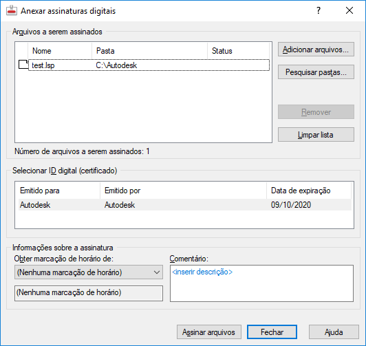 Anexa uma assinatura digital a todos os arquivos relacionados nessa caixa de diálogo.