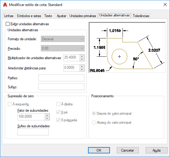 Especifica a exibição de unidades alternativas em medidas de cotas e define o seu formato e a sua precisão.