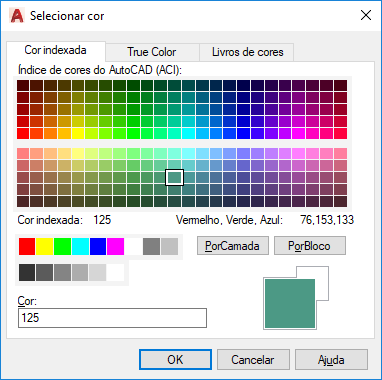 É possível selecionar entre as 255 cores do Índice de cores do AutoCAD (ACI), true colors e cores do Livro de cores disponíveis em três guias.
