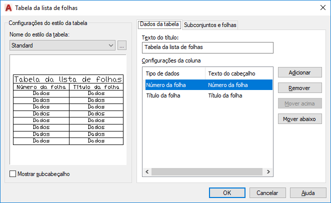 Esta tabela pode ser adicionada a qualquer folha no conjunto atual de folhas, mas é normalmente adicionada à folha de título.