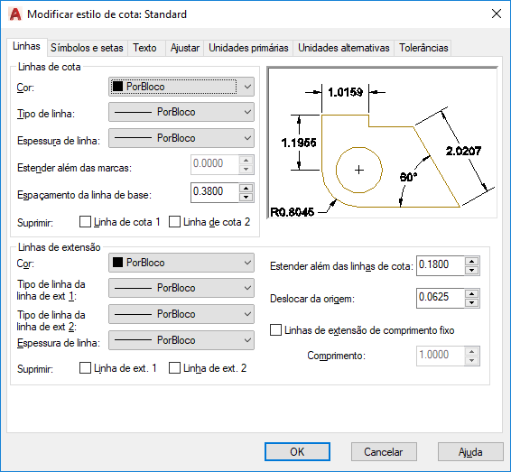 Estilos de cota ajudam a definir e aplicar os desenhos padrão. Há muitas variáveis de cota que podem ser definidas com o comando ESTILOCOTA para controlar quase todas as nuances de aparência e de comportamento das cotas. Todas as configurações são armazenadas em cada estilo de cota.