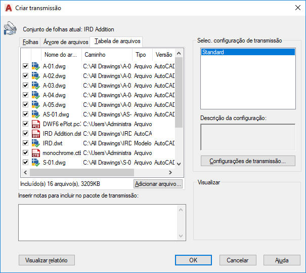 Por padrão, todos os arquivos associados ao desenho atual (como refex, estilos de plotagem e fontes relacionados) são apresentados. Você pode adicionar arquivos ao pacote de transmissão ou remover arquivos existentes. Os arquivos relacionados que são mencionados pelos URLs não são incluídos no pacote de transmissão.