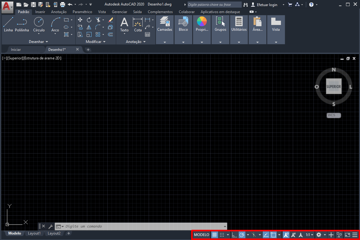 A barra de status exibe a posição do cursor, ferramentas de desenho e ferramentas que afetam o ambiente de desenho.