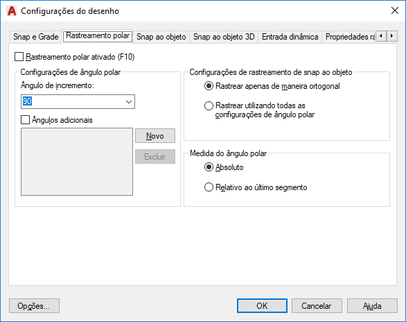 Se os Ângulos Adicionais são selecionados, os ângulos adicionais disponíveis são listados. Para adicionar novos ângulos, clique em Novo. Para remover ângulos existentes, clique em Excluir. (variável de sistema POLARADDANG)