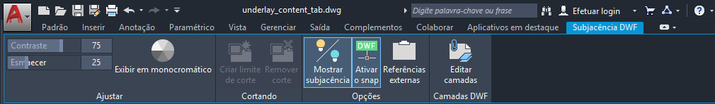 Quando você seleciona uma subjacência DWF em um desenho, a guia contextual Subjacência DWF é exibida na faixa de opções.