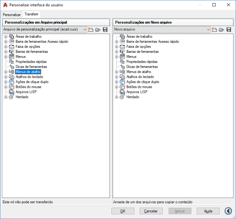 Quando você insere IMPORTARIUP no prompt do comando, o arquivo CUIx principal é exibido no painel direito (acad.cuix para arquivos do AutoCAD ou acadlt.cuix para arquivos do AutoCAD LT por padrão). Você abre um arquivo CUIx ou um arquivo de personalização herdado no painel esquerdo para transferir dados. Quando você insere EXPORTARIUP no prompt de comando, o arquivo CUIx principal é exibido no painel esquerdo. Você abre outro arquivo CUIx ou arquivo de personalização herdado no painel direito para transferir dados.