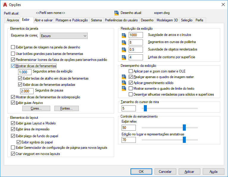 Controla configurações de exibição específicas para o ambiente de desenho.