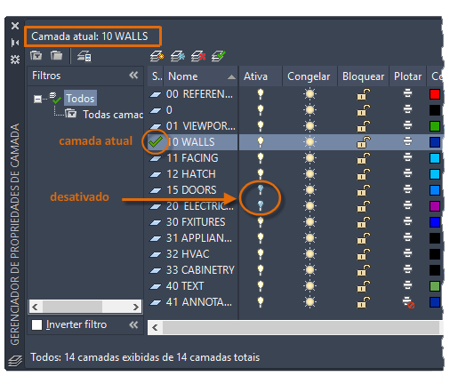 Na coluna marcada como Ativada, observe que os ícones de lâmpada de duas camadas estão escuros. Essas camadas foram desativadas para ocultar as portas e a fiação elétrica na planta de piso.