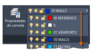 Para ver como um desenho é organizado, utilize o comando CAMADA para abrir o Gerenciador de propriedades de camada. É possível inserir CAMADA ou CA na janela Comando, ou é possível clicar na ferramenta Propriedades da camada, na faixa de opções.