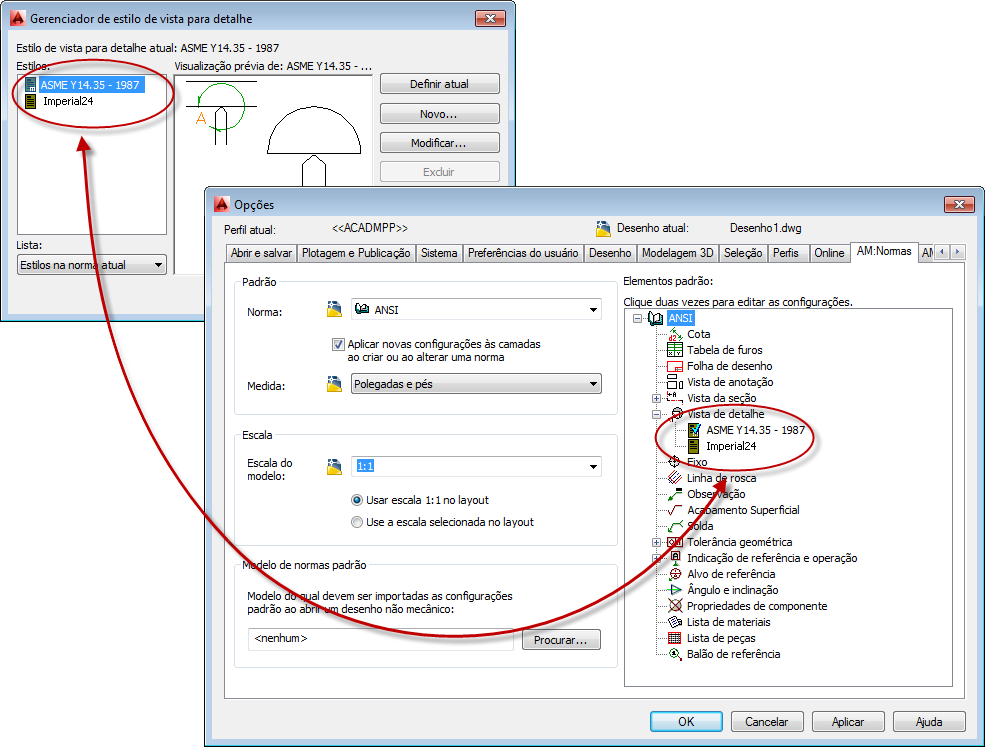 As configurações que controlam a aparência de objetos do AutoCAD Mechanical toolset são salvas em um grupo de configurações de nome norma de desenho. Sendo assim, a forma na qual os estilos de vista de detalhe são aplicados aos objetos do AutoCAD (vistas de detalhe da documentação do modelo) é diferente da forma como são aplicados aos objetos do AutoCAD Mechanical toolset (vistas de detalhe criadas com o comando AMDETAIL). Consequentemente;
