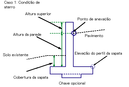 A altura da parede é determinada a partir da parte superior da sapata para ponto de anexação de elevação do solo na face vertical, o que for maior. Largura da sapata, deslocamento da face vertical da parede, chave cotas opcional, e a localização do centro da chave, são as funções da altura da parede.