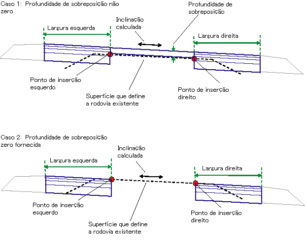 As elevações nos pontos de inserção esquerdo e direito na existente são determinados, e a inclinação é calculada entre os dois pontos. Se uma profundidade de sobreposição não zero for fornecida, uma sobreposição de camada é adicionada acima da pista existente e na inclinação calculada. Uma forma de sobreposição fechada é criada ao substituir um ou mais vínculos acima da declividade existente. As pistas de alargamento são inseridas para fora das bordas de sobreposição as larguras determinadas na inclinação calculada.