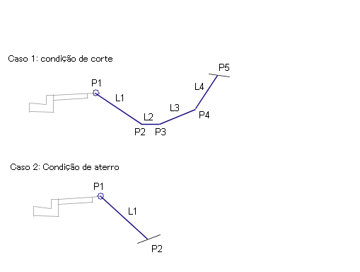 Condição de corte somente - bordo interno de valeta Condição de aterro somente - ponto de talude |