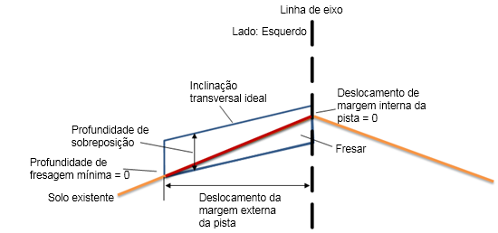 A inclinação transversal e os ajustes de elevação corresponderão ao Nível mínimo e/ou à Profundidade mínima da fresagem. A base é a superfície existente.