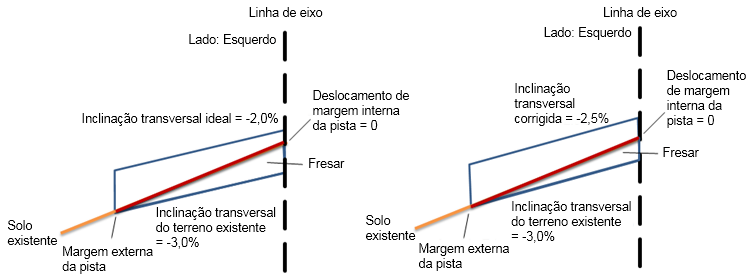 O valor definido para a inclinação transversal corrigida é sempre igual ao valor definido para a inclinação do solo existente.