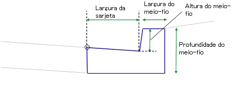 No modo do layout, esta submontagem desenha o formato de meio-fio e sarjeta conforme especificado pelos valores de parâmetro de entrada.