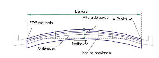 O centro da linha de sequência é calculado subtraindo a altura da coroa do ponto de anexação e as bordas esquerda e direita da pista de rolamento são calculados ao aplicar a largura e a inclinação simetricamente sobre o ponto de anexação. As ordenadas da curva parabólica são calculadas em intervalos pares ao longo da linha de sequência e os vínculos de linha reta são adicionados para se conectar a pontos de ordenada. Superfícies paralelas são inseridas para as superfícies Pave1, Pave2, Base e de Sub-base à partir de profundidades especificadas.
