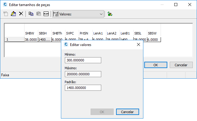 Agora quando você clica no valor do parâmetro de tamanho que editou (por exemplo, LenB1) na caixa de diálogo Editar tamanhos de peça, a lista de tamanhos recém adicionada é exibida.