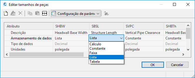 - Para adicionar uma lista de tamanhos de peças disponíveis para a peça, altere o tipo de armazenamento de dados de um parâmetro de tamanho para Lista.