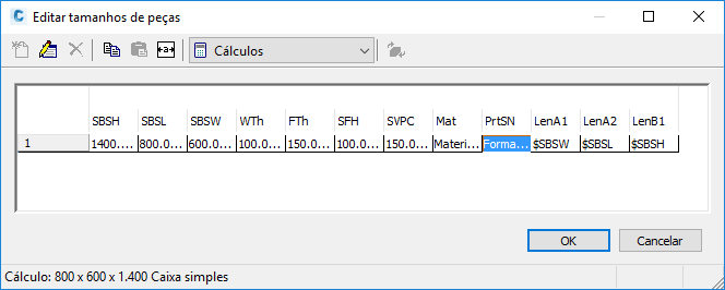 - Para especificar um nome de tamanho de peça calculado único, selecione Cálculos na caixa de listagem da barra de ferramentas.