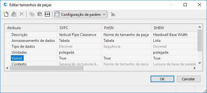 A caixa de diálogo Editar tamanhos de peça é exibida, mostrando todos os parâmetros de tamanho no momento disponíveis para a peça selecionada. Para o exemplo de Estrutura cilíndrica simples, alguns parâmetros de tamanho de peça são Nome do tamanho da peça (PrtSN) e Folga da tubulação de estrutura vertical (SVPC).