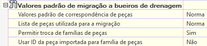 As configurações Padrão de correspondência de peça são encontradas nas configurações do recurso para Redes de tubulação nos Padrões de migração do Storm Sewers.