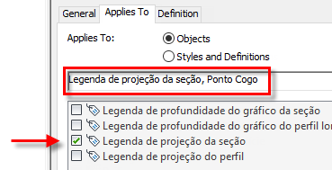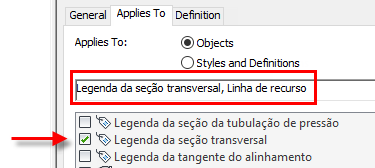 Se você desejar incluir dados de conjunto de propriedades em estilos de legenda de cruzamento, você precisa selecionar o tipo de objeto Legenda de seção de cruzamento além do tipo de objeto cujo local de cruzamento é mostrado no gráfico de seção.