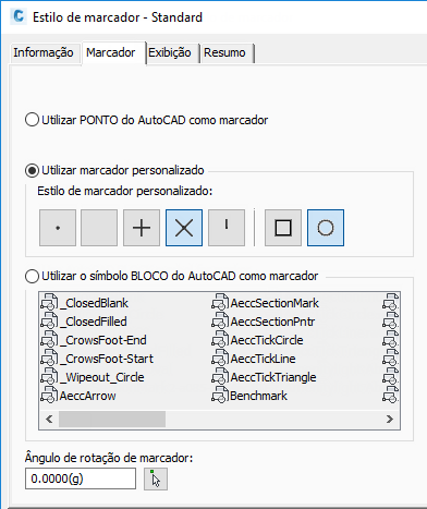 Os Estilos de marcador podem ser definidos para usar pontos do AutoCAD, símbolos personalizados do marcador ou blocos.