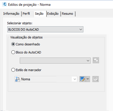 Se você desejar incluir dados de conjunto de propriedades em estilos de legenda de projeção, você precisa selecionar o tipo de objeto Legenda de seção de projeção além do tipo de objeto cuja projeção é mostrada no gráfico de seção.